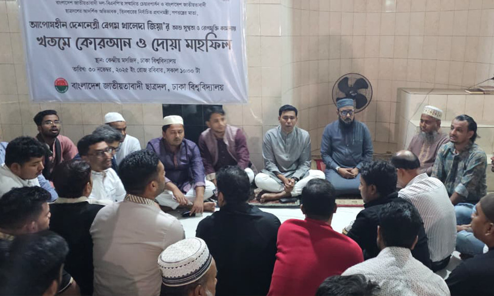 বাংলাদেশ জাতীয়তাবাদী দল (বিএনপি) চেয়ারপারসন ও তিনবারের সাবেক প্রধানমন্ত্রী বেগম খালেদা জিয়ার দ্রুত সুস্থতা ও রোগমুক্তি কামনায় খতমে কোরআন এবং দোয়া মাহফিল করেছে বাংলাদেশ জাতীয়তাবাদী ছাত্রদল, ঢাকা বিশ্ববিদ্যালয় শাখা। রবিবার